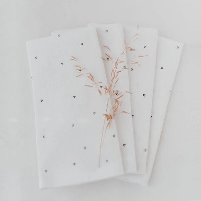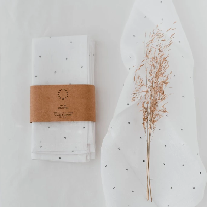 Mit dem klassischen Servietten-Set Herzen von Eulenschnitt bringen Sie Exklusivität und Stil auf Ihren Esstisch. Das elegante Set besteht aus vier Servietten, welche sich als ideale Grundlage für einen liebevoll gedeckten Tisch eignen. Die verspielten Herzchen-Motive in fein abgestimmter Farbgebung sorgen dabei für ein romantisches Ambiente. Sie bestehen aus 100% vorgewaschenem Leinen und sind nachhaltig sowie langlebig. Somit tun Sie mit dem Servietten 4er Set Herzen von Eulenschnitt nicht nur etwas Gutes für die Umwelt, sondern verleihen jeder gedeckten Tafel den nötigen Feinschliff. Wir bieten Ihnen aus dem Hause Eulenschnitt verschiedene Servietten-Sets und passende Tischläufer in unserem AMBIENDO Shop an. Überzeugen Sie sich selbst von Qualität und Design!