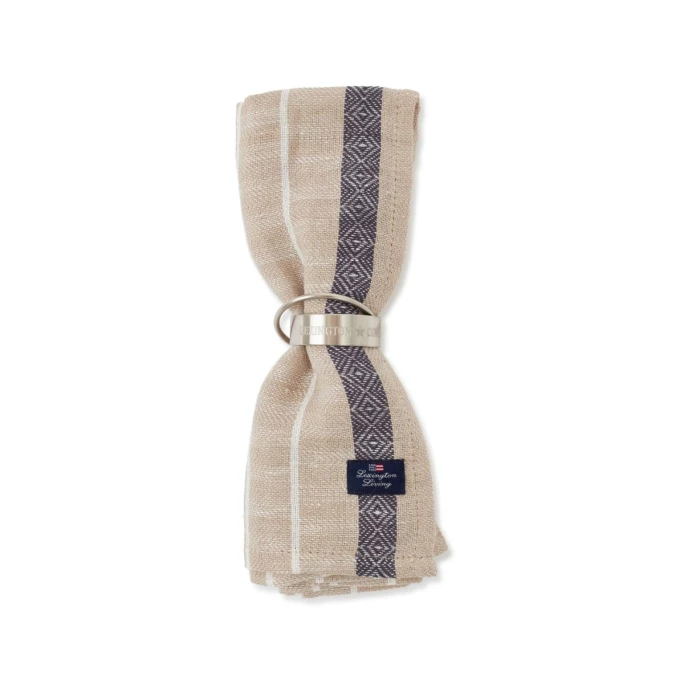 Mit passenden Servietten verleihen Sie einer gedeckten Tafel den nötigen Feinschliff! Die Organic Cotton/Linen Jacquard Serviette von Lexington ist aus Bio-Baumwolle und Leinen gefertigt und beeindruckt durch feine Streifen und elegante Zierborten an den Rändern. Egal ob im Alltag oder auf der festlich dekorierten Tafel: Organic Cotton/Linen Jacquard lässt sich durch die zurückhaltende Farbgebung hervorragend mit buntem oder klassisch weißem Geschirr kombinieren und ist auch als kleine Mitteldecke, mit Kerzen oder einem hübschen Blumenarrangement in Szene gesetzt, ein echter Hingucker. Und wenn Sie es gerne ganz besonders mögen, dann bestellen Sie die ausgefallenen Lexington Metal Rolling Serviettenringe gleich dazu und machen den Look perfekt! Überzeugen Sie sich selbst und dekorieren Ihre Tafel mit der Organic Cotton/Linen Jacquard Serviette aus dem Hause Lexington!